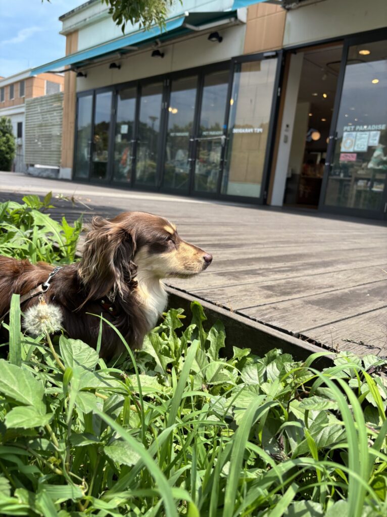 ペットの犬と色鮮やかな草花が綺麗