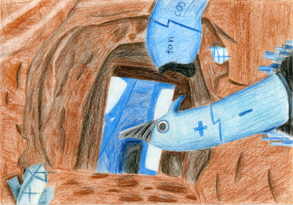 meeting with demon mole in the cave (洞窟でデーモン・モルと会う。) 作者 不破健杜(高校 1年生) 校舎 星槎国際名古屋 サイズ 210mm×297mm 備考 色鉛筆画